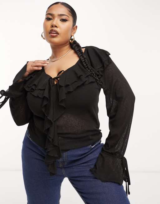 Camisa negra con volantes delanteros de malla de River Island Plus Very well made.