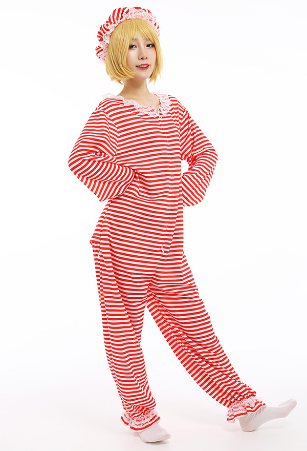 Women Retro Striped Onesie Pajamas Hooded Long Sleeve Home Wear Pajama Kigurumi Outfit Very well made.
